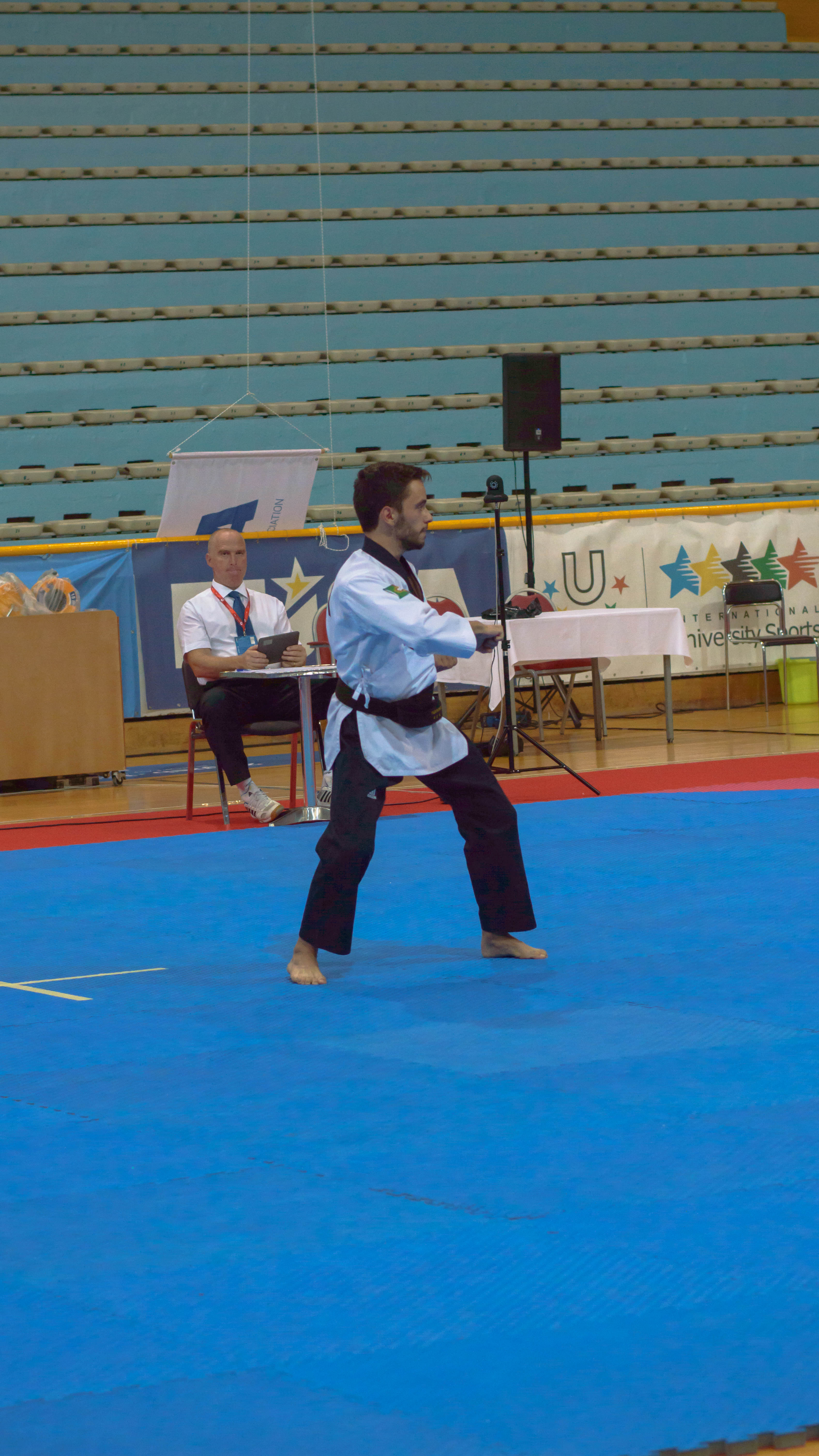 The first day of the taekwondo competition, we witnessed the poomsae competition, and we got the first champions of the European Universities Games. In the recognized form, poomsaea, Frans Salmi from the University of Turku, from Finland, won first place, Diogo Ramalho from Portugal came second, while third place was shared by Joao Moreira from the Catholic University of Portugal, and Victor Francey from the University of Fribourg.
